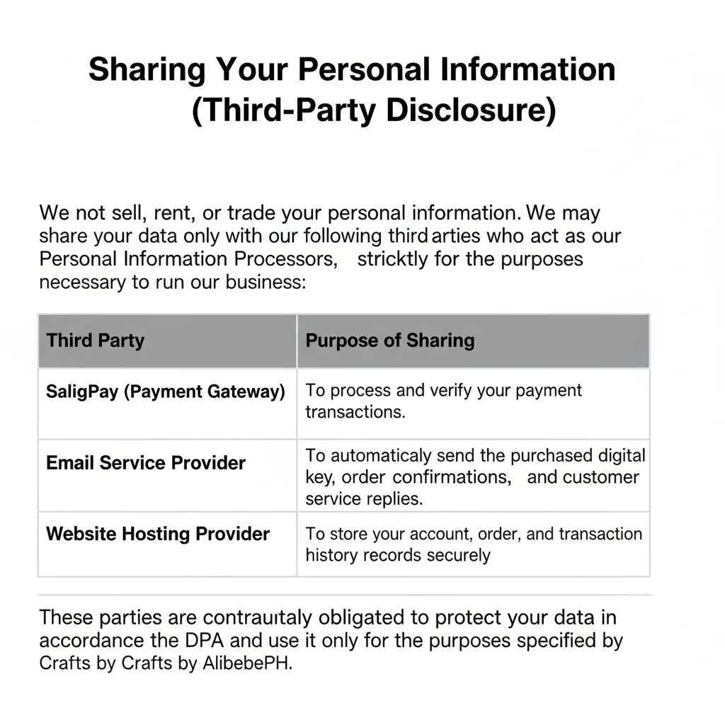 These parties are contractually obligated to protect your data in accordance with the DPA and use it only for the purposes specified by Crafts by AlibebePH.