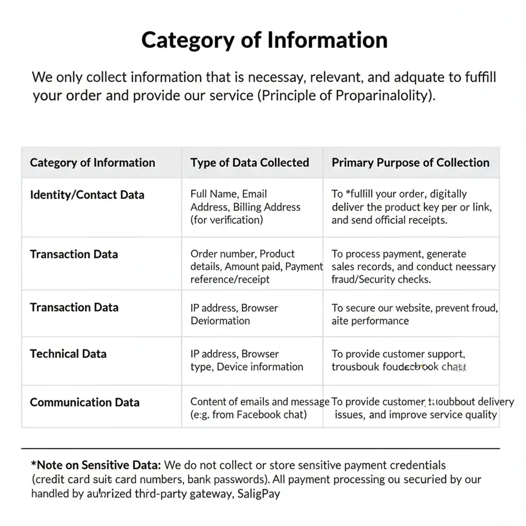We only collect information that is necessary, relevant, and adequate to fulfill your order and provide our service (Principle of Proportionality).